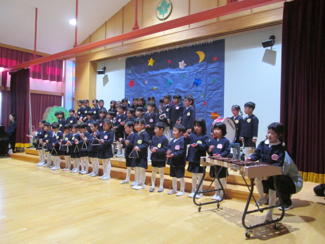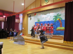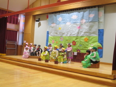 2025年12月12日(金)におゆうぎ会がありました。年少から年長まで、どのクラスも練習から大きな声で張り切って取り組み、、お友だちのセリフも覚え口ずさむ姿がありました。本番では練習以上に大きな声で、またとっても楽しそうに演じる子ども達の姿に、逞しさと成長を感じました。お母さんお父さん、おばあちゃんおじいちゃんにもお子さんの成長を感じていただけたことと思います。 |