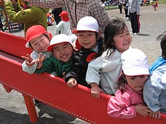 5月14日(金)「元気が出る公園」へ行きました。 風が強く寒い日でしたが、家で工夫して作ってきた ダンボールのそりで、親子で芝すべりを思いきり楽し みました。 |