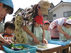 5月18日(火)園庭で年長組がバーべキューをしました。 役員のお母さんについてもらい、材料の野菜を切る体験 もしました。みんなで食べる本格炭火バーベキューは 格別だったようです。 |