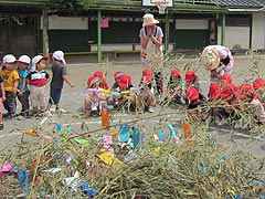 七夕焼き・・・ 皆で作った笹飾りを、願いをこめてお庭で焼きました。煙はモクモクとお空に向かい、織姫さまと彦星さまに届いたようです。 |