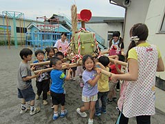 樽みこし・・・ 祇園祭で使うおみこしを貸してもらい、1日早くお庭で担がせてもらいました。皆で力を合わせて楽しく担ぎました。 |