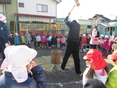 12月6日(金)に園庭で「おもちつき会」をしました。最初に園長先生についていただき、子どもたちはもちもちになっていくお餅に目を輝かせながら「よいしょ!よいしょ!」と声援を送りました。代表で松組のお友だちが順番におもちつきをしました。ついたお餅はあんこときなこ2つずつととうふ汁とおつけものと一緒においしくいただきました。日本の伝統行事にふれた一日でした。 |