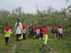5月6日(金)にりんご園へお花見に行きました。 りんごのお花を見て、「この花がりんごになるんだね!」とわくわく嬉しそうなこども達でした。 秋にりんごがなるのが楽しみですね。 |