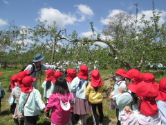 5月2日にりんご園へお花見に行きました。りんご園へ着くまでの道では沢山のお花が咲いていました。りんご園ではりんごの花を見ながら「この花がりんごになるの?」と興味深々なこどもたち。みんなで「美味しいりんごがなりますように」とお願いをしました。 秋にはりんご狩りをさせていただくのが楽しみですね。 |