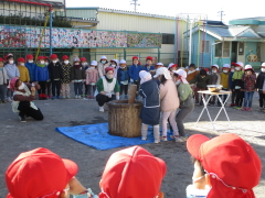 12月1日におもちつきをしました。 臼や杵、そしておもちつきを初めて見る園児が多かったことと思います。 年少さん年中さんに「よいしょ~!」の掛け声で応援してもらい、年長さんは初めて自分たちでおもちをつきました! みんなで一生懸命ついたおもちは、とても美味しかったです。あんこときなこで美味しくいただきました。 |