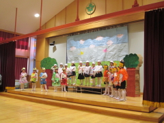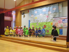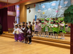 2025年12月12日(金)におゆうぎ会がありました。年少から年長まで、どのクラスも練習から大きな声で張り切って取り組み、、お友だちのセリフも覚え口ずさむ姿がありました。本番では練習以上に大きな声で、またとっても楽しそうに演じる子ども達の姿に、逞しさと成長を感じました。お母さんお父さん、おばあちゃんおじいちゃんにもお子さんの成長を感じていただけたことと思います。 |